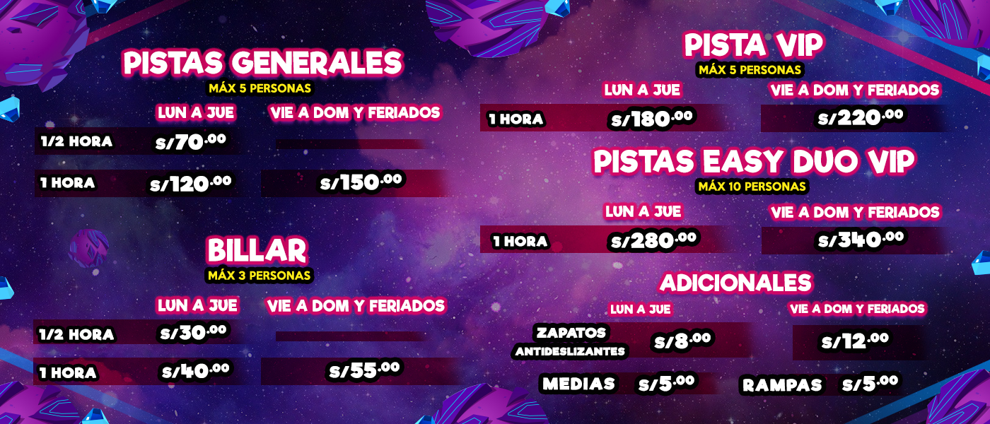 2. El ingreso a las pistas es por orden de llegada según se cancele en caja. Solo se realizan reservaciones para cumpleaños, eventos corporativos y colegios. Si hay tiempo de espera, lo llamaremos cuando llegue su turno. Por favor, acérquese a caja lo antes posible para entregarle el número de pista. Si demora, perderá su turno.